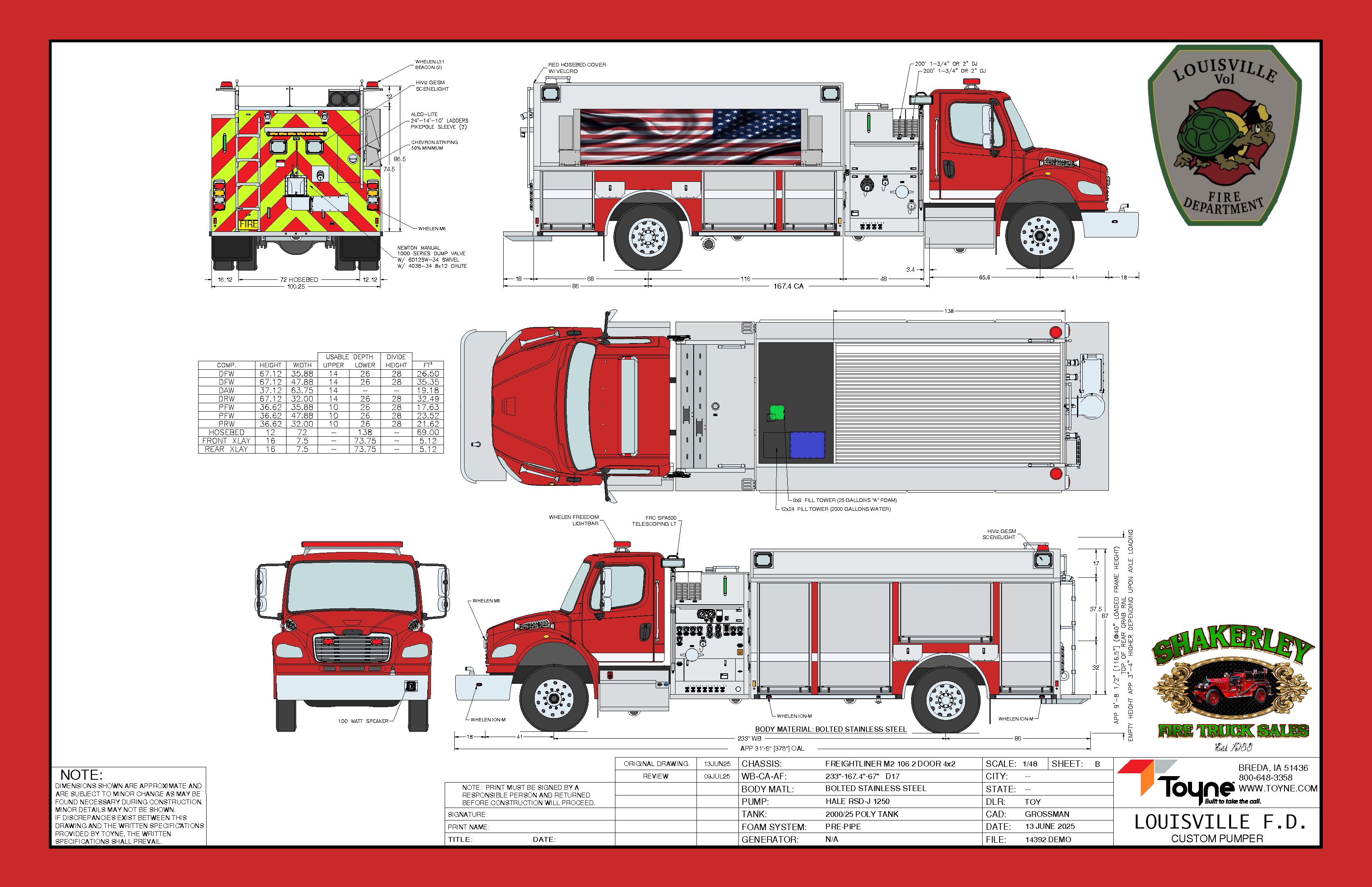 We are grateful to the Louisville Fire Department for choosing Toyne and SFTS for their new Tanker project. This unit will be built on a Freightliner 106 Plus chassis and equipped with a Hale 1250 GPM pump, 2000 gallon poly tank, 10" Newton swivel dump, and a Zico drop down tank rack.