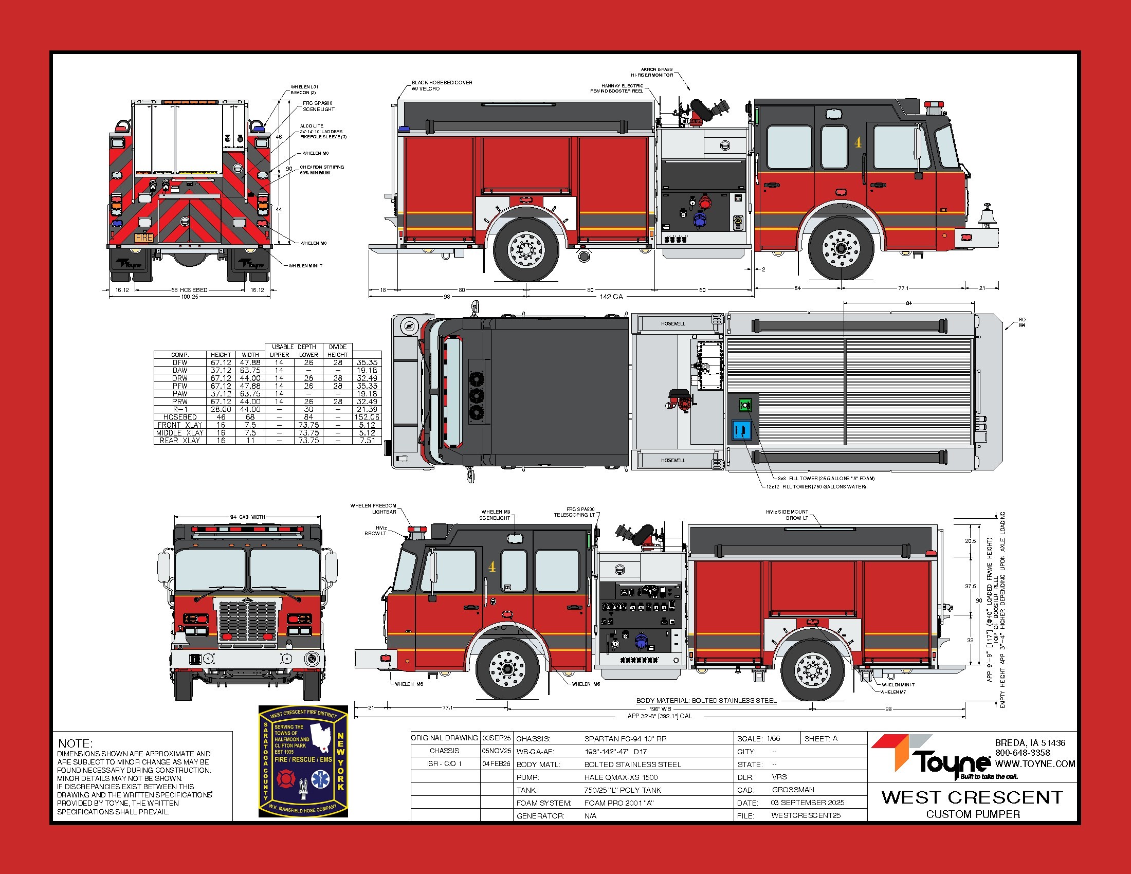 We are grateful to the West Crescent Fire District for choosing Toyne and SFTS for their new Custom Pumper. This unit will be built on a Spartan FC94 chassis and equipped with a Hale Q-Max-XS 1500 GPM pump, 7500 gallon tank, and a Toyne Stainless Steel body.